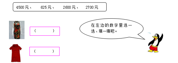 4. 一件名牌西装的价格是2678元,一件女式旗袍的价钱比它高的多得多,一件针织衫的价格比西装少得多,一件旗袍和一件针织衫的价钱大约是多少呢?