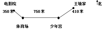 王敏从家向( )方向走( )米到少年宫,又向( )面走( )米到体育场,再向( )方向走( )米到电影院。