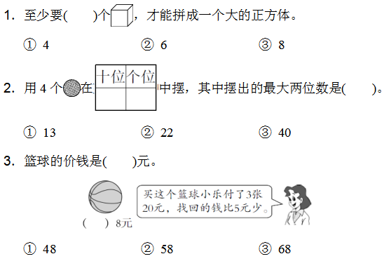 4.写出三个十位比个位少2的两位数( )、( )、( )。